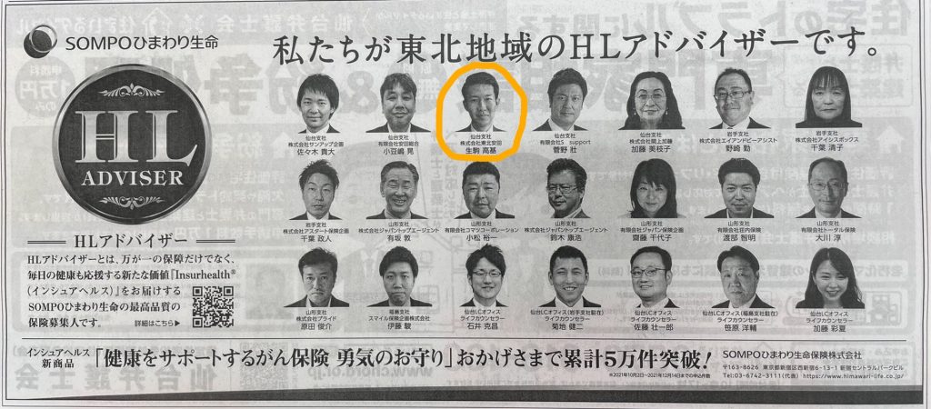 「高いコンサルティング提案力」、「健康応援の実現」、「お客さま本意の業務運営」を兼ね備えたSOMPOひまわり生命保険最高品質の生命保険募集人である、HLアドバイザーに選ばれました!